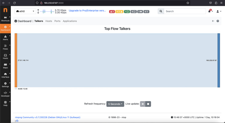 ¡Enhorabuena! Has instalado Ntopng en tu Debian 11. Ntopng proporciona muchas otras opciones que pueden ser muy útiles para monitorizar la red en tiempo real y generar alertas. Puedes ver información del sistema y también configurar el punto final de alerta. Puedes preguntarme si tienes alguna duda.
