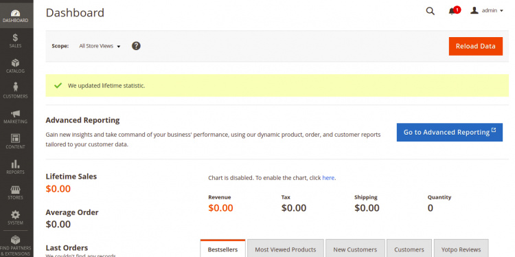 Proporciona tu nombre de usuario y contraseña de administrador, y haz clic en el botón Iniciar sesión. Deberías ver el salpicadero de Magento en la siguiente pantalla:
