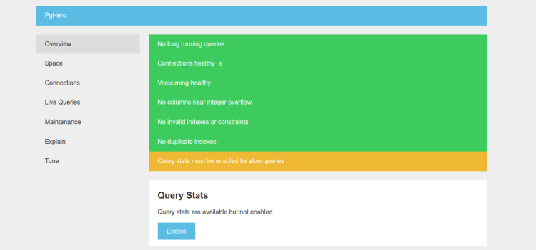 Puedes comprobar el estado de PgHero con el siguiente comando: