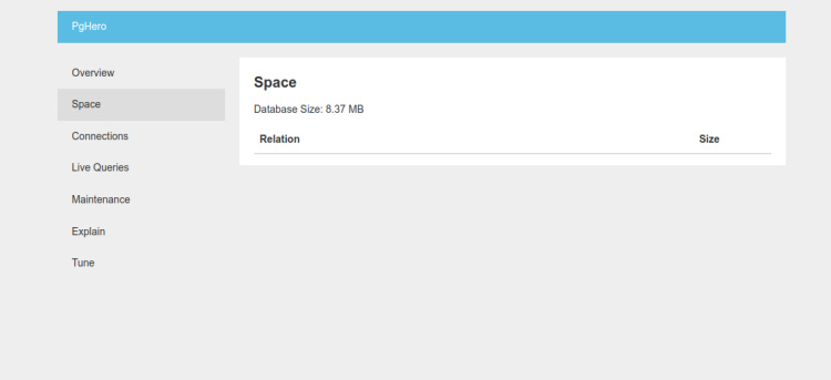 Ahora, abre tu navegador web y accede a la interfaz web de PgHero utilizando la URL http://pghero.example.com. Deberías ver el panel de control de PgHero en la siguiente pantalla: