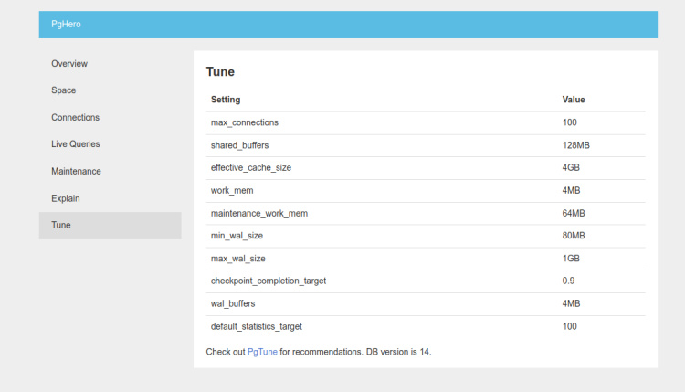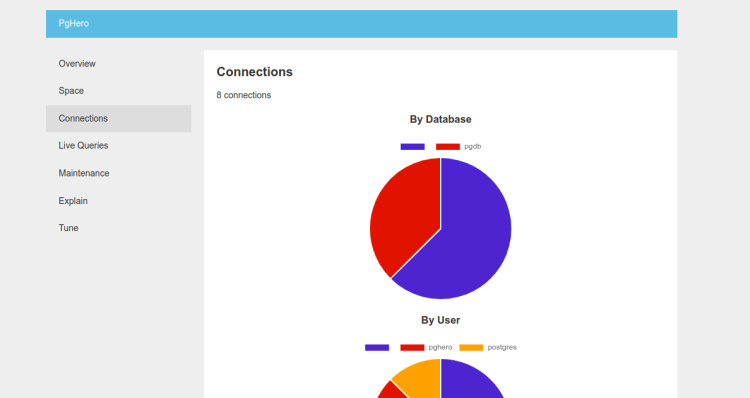 PgHero es una herramienta de código abierto y basada en web diseñada para monitorizar PostgreSQL a través de un navegador web. Ayuda a los usuarios que no están familiarizados con la línea de comandos. Ofrece un panel de control sencillo y fácil de usar para supervisar PostgreSQL y muestra métricas del sistema como el uso de recursos, comprobaciones de salud, etc. Ofrece una visión general fácil de interpretar: verde en bueno, no verde, debes prestar atención, etc. PgHero proporciona un estado general rápido de tu base de datos, un vistazo a las consultas que se están ejecutando, los índices de las tablas y el espacio de las tablas, y puede darte una forma de obtener explicaciones de las consultas sin tener que saltar a la consola psql.