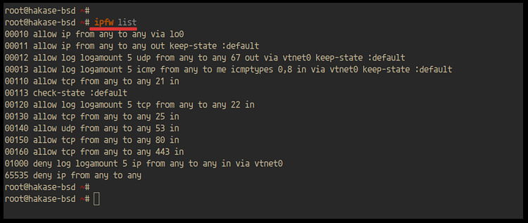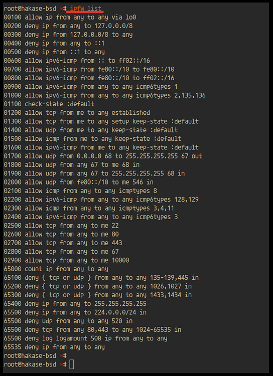 Ahora la configuración básica del cortafuegos ipfw en FreeBSD 12.0 se ha completado con éxito.