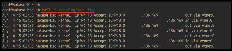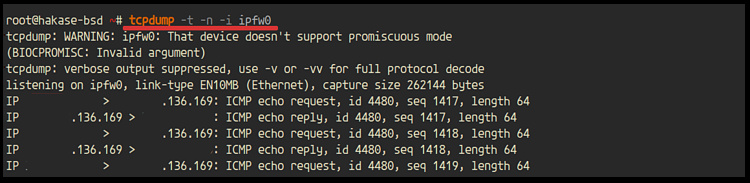 Y si estás utilizando la interfaz de pseudo-registro ‘ipfw0’, puedes comprobar los registros utilizando el siguiente comando tcpdump.