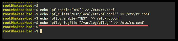 echo 'pflog_enable="YES"' >> /etc/rc.conf echo 'pflog_logfile="/var/log/pflog"' >> /etc/rc.conf