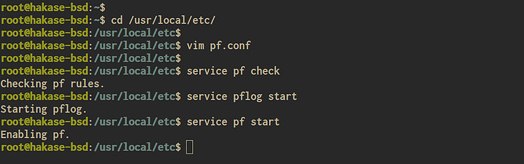 El cortafuegos pf puede habilitarse añadiendo la configuración al archivo ‘/etc/rc.conf’. Ejecuta el siguiente comando para habilitar el cortafuegos pf.