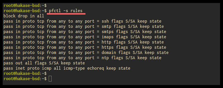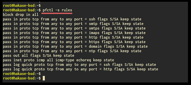 Además, puedes comprobar la lista de reglas pf utilizando la línea de comandos ‘pfctl’ como se indica a continuación.