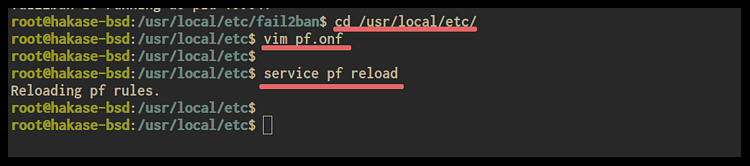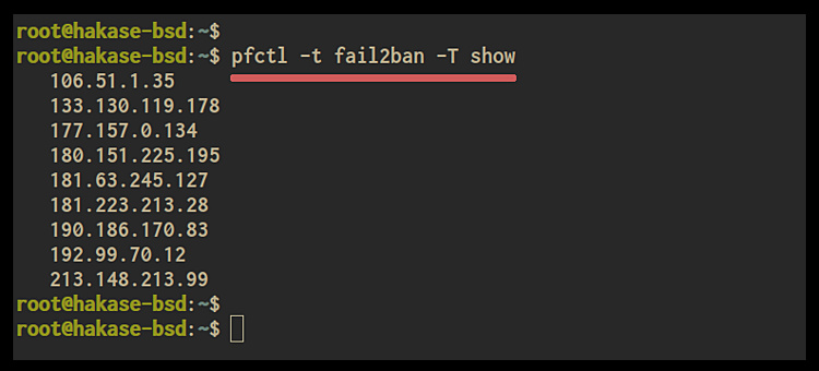 Como resultado, se ha completado la configuración del cortafuegos pf y de fail2ban. Y todas las direcciones IP capturadas por el fail2ban serán baneadas con el cortafuegos pf.