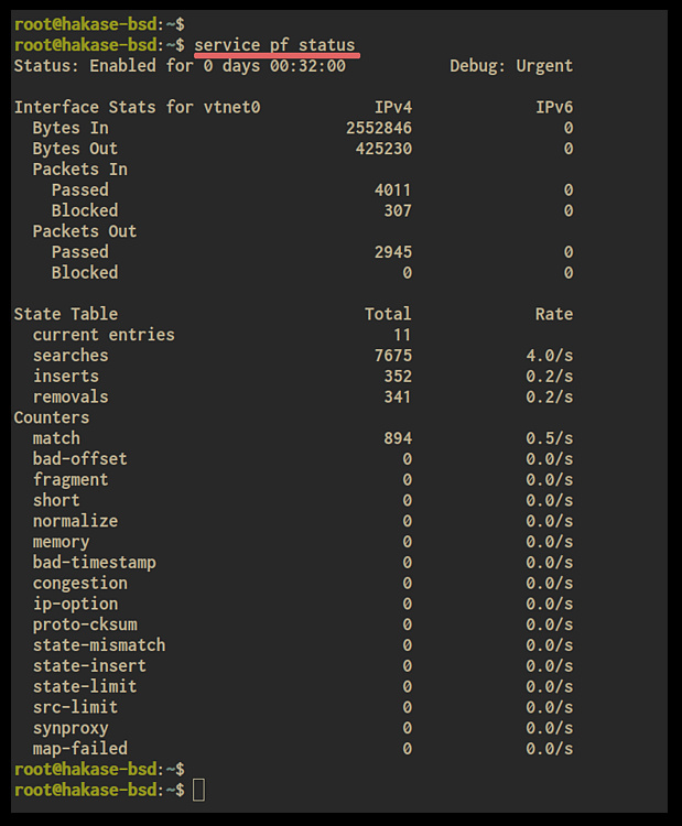 Por defecto, el sistema FreeBSD está integrado con el cortafuegos pf. Está integrado en el kernel de FreeBSD, pero el servicio aún no se ejecuta en el servidor.