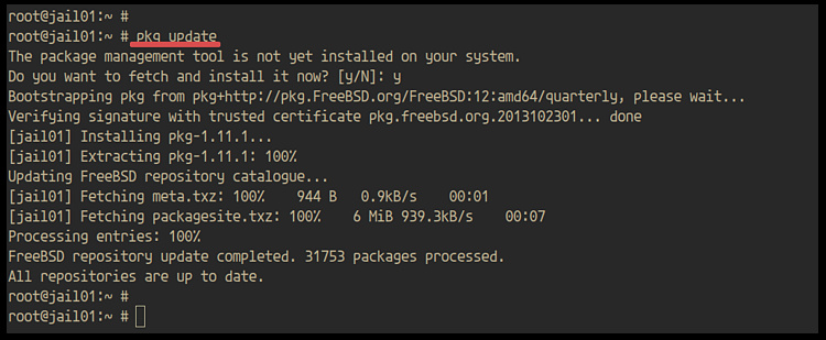 En primer lugar, actualiza los paquetes binarios de la jaula utilizando el comando pkg que se indica a continuación.