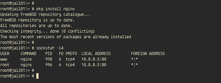 Después, instala el servidor web nginx dentro de la jaula utilizando el siguiente comando pkg.