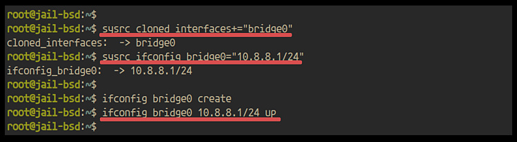 sysrc cloned_interfaces+="bridge0" sysrc ifconfig_bridge0="10.8.8.1/24"
