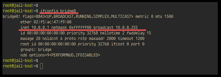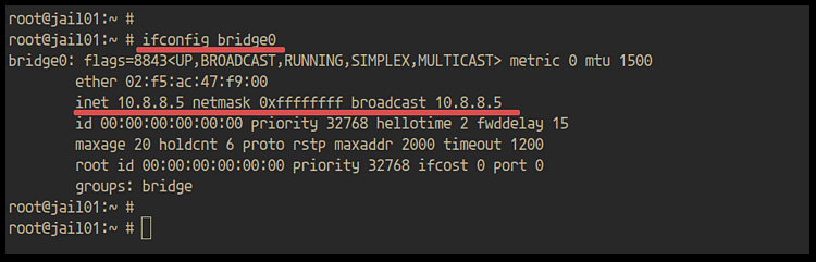 Dentro de la jaula, comprueba la dirección IP de la interfaz ‘bridge0’ en la ‘jail01’.