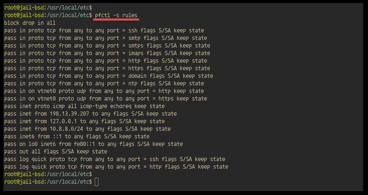 Después, comprueba todas las reglas del cortafuegos pf utilizando el siguiente comando.