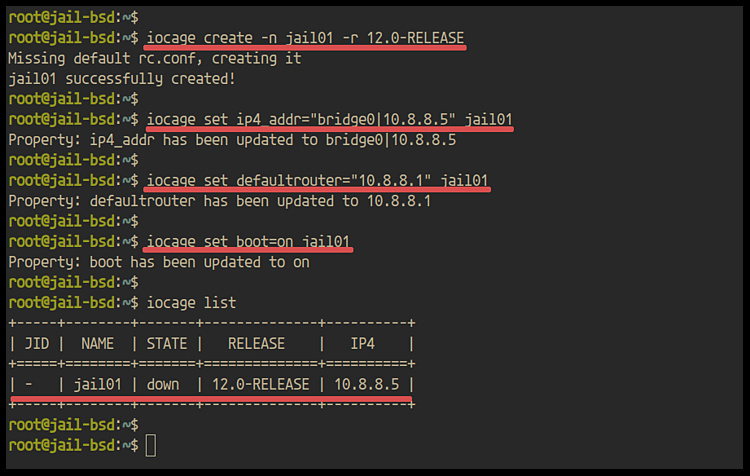 Y obtendrás la ‘jail01’ con la dirección IP ‘10.8.8.5’ y basada en la release ‘12.0’ de FreeBSD.