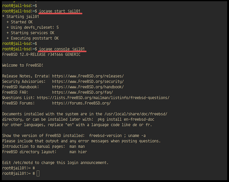 Ahora la instalación de Iocage en FreeBSD 12.0 se ha completado, y puedes utilizar la línea de comandos iocage para crear y gestionar la jaula FreeBSD.
