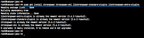 sudo apt update sudo apt install strongswan strongswan-pki libstrongswan-standard-plugins libstrongswan-extra-plugins