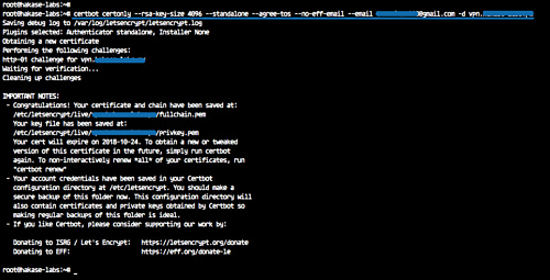 certbot certonly --rsa-key-size 4096 --standalone --agree-tos --no-eff-email --email [email protected] -d vpn.hakase-labs.pw