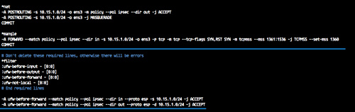 *nat -A POSTROUTING -s 10.15.1.0/24 -o ens3 -m policy --pol ipsec --dir out -j ACCEPT -A POSTROUTING -s 10.15.1.0/24 -o ens3 -j MASQUERADE COMMIT *mangle -A FORWARD --match policy --pol ipsec --dir in -s 10.15.1.0/24 -o ens3 -p tcp -m tcp --tcp-flags SYN,RST SYN -m tcpmss --mss 1361:1536 -j TCPMSS --set-mss 1360 COMMIT
