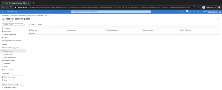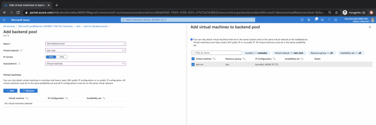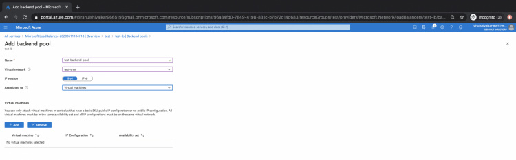 Aquí da un nombre al Backend Pool como test-backend-pool, selecciona una red virtual en la que estén disponibles tus máquinas virtuales.