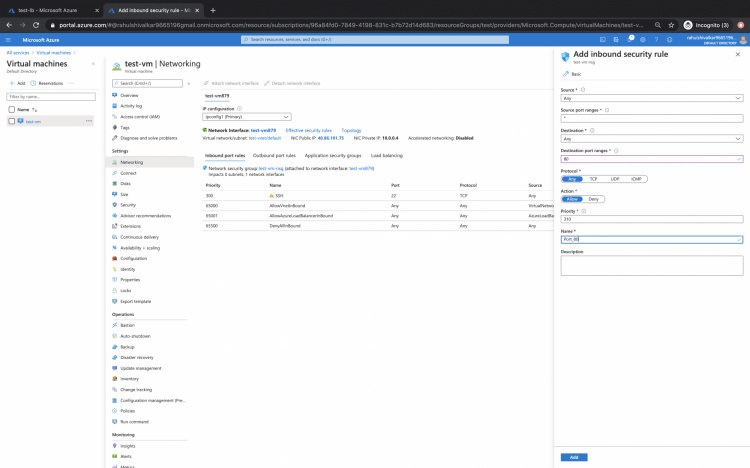 Ve a la Máquina Virtual, haz clic en Redes y Añade la siguiente regla de seguridad de entrada que permitirá la conexión entrante en el Puerto 80 de la Máquina Virtual desde cualquier lugar.