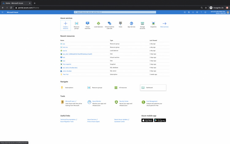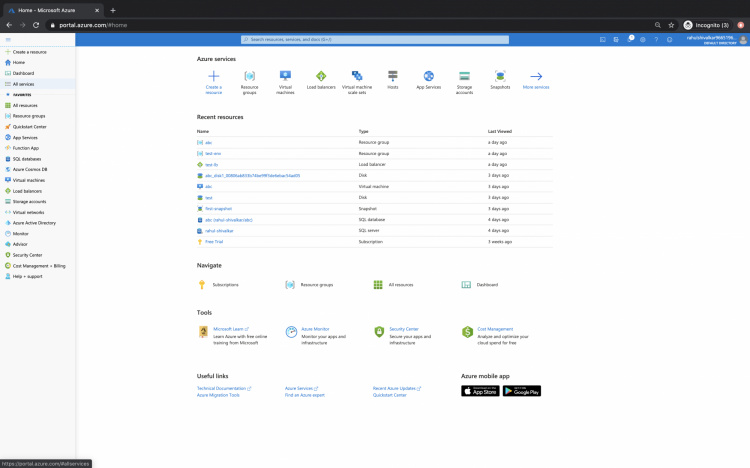 Verás la página principal como se indica a continuación una vez que hayas accedido correctamente a tu cuenta. Haz clic en 3 líneas cerca de «Microsoft Azure» en la esquina superior izquierda del portal Azure para mostrar el menú del portal.