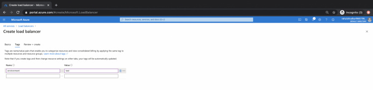 Añade una etiqueta como «entorno: prueba», puedes añadir varias etiquetas según tu elección. Haz clic en «Revisar+crear».