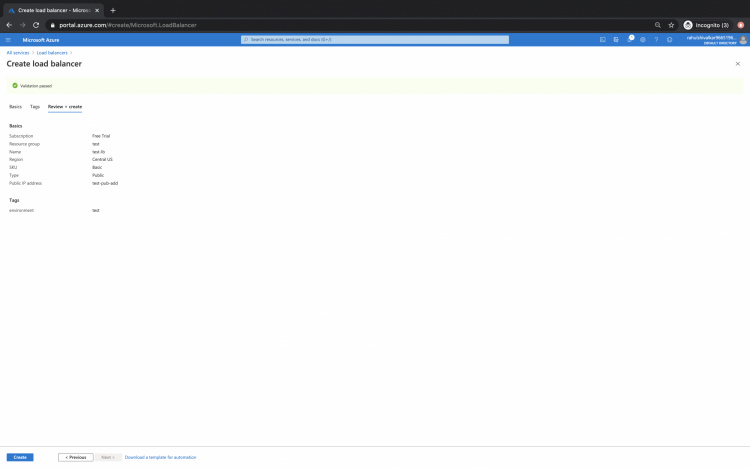 Cuando veas el mensaje «Validación superada», haz clic en «Crear».