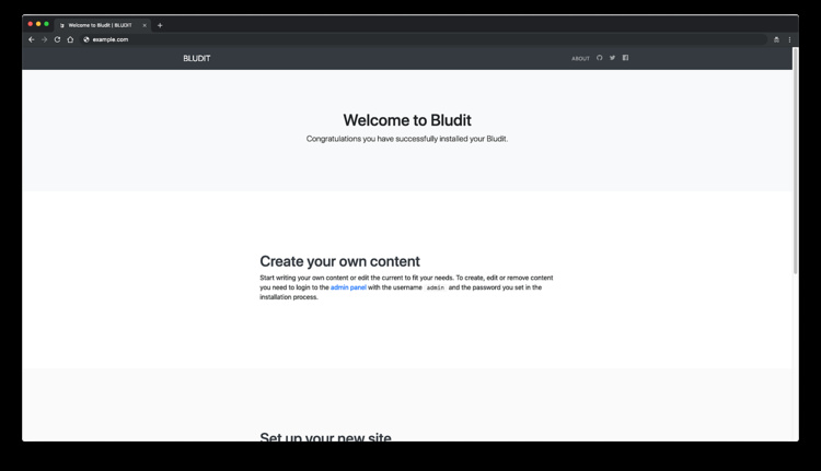 Tras crear una contraseña de administrador, serás redirigido al frontend de Bludit: