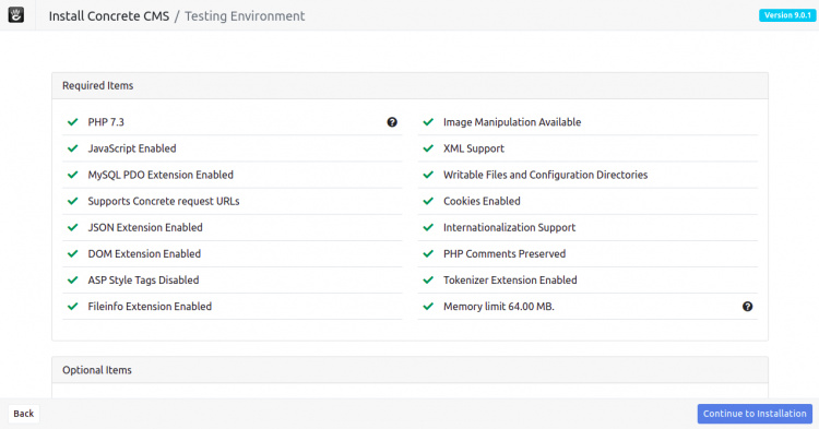 Asegúrate de que todas las extensiones PHP están instaladas y haz clic en el botón Continuar con la instalación. Deberías ver la siguiente página: