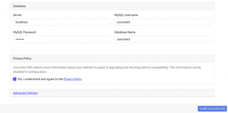 Concrete5 utiliza MariaDB o MySQL como base de datos. Así que necesitarás crear una base de datos y un usuario para Concrete5.