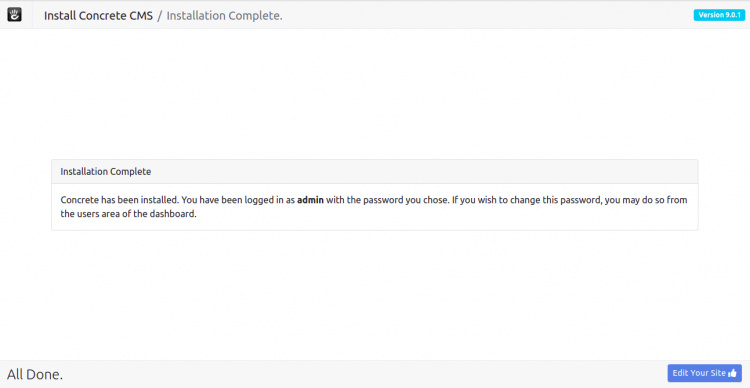 Proporciona tu nombre de usuario admin, contraseña, nombre de la base de datos, nombre de usuario de la base de datos, contraseña y haz clic en el botón Instalar Concrete5. Una vez finalizada la instalación, deberías ver la siguiente página: