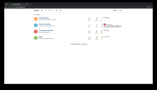 Enhorabuena! Has instalado y desplegado con éxito la plataforma de debate NodeBB en el sistema FreeBSD 12.Deberías poder acceder a tu foro en tu dominio e interactuar con él.