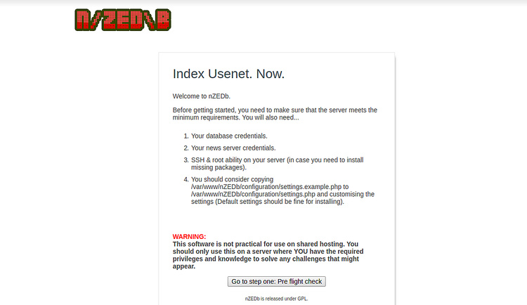 nZEDb ya está instalado y configurado. A continuación, abre tu navegador web y escribe la URL http://your-ip-address/install. Se te redirigirá a la siguiente página:
