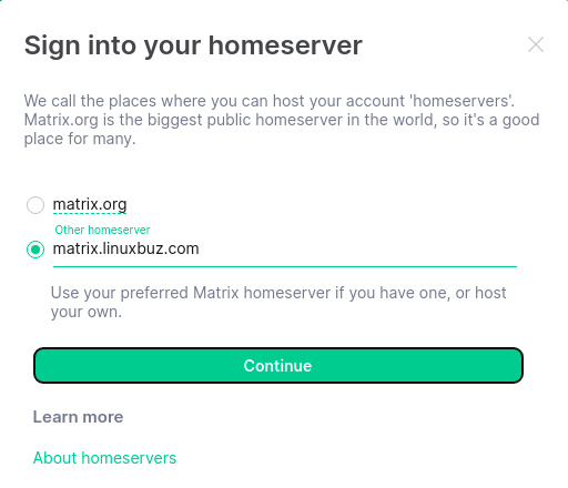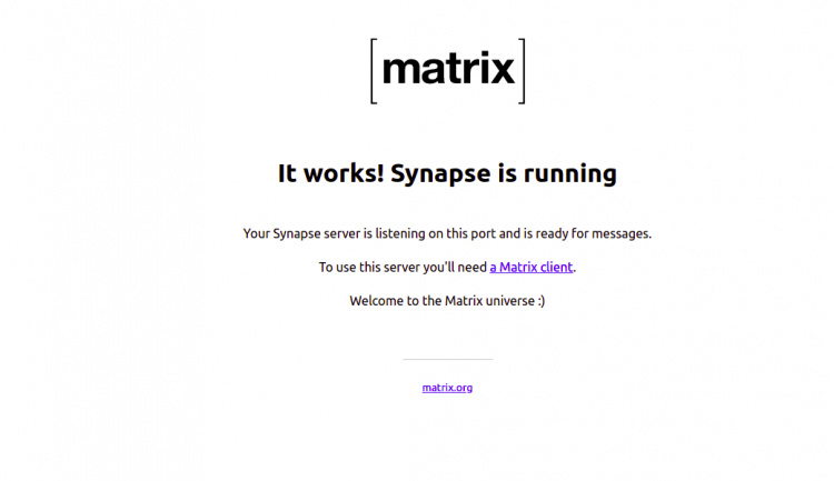 Ahora puedes verificar la instalación de Matrix Synapse utilizando la URL https://matrix.linuxbuz.com de tu navegador web. Deberías ver la siguiente pantalla: