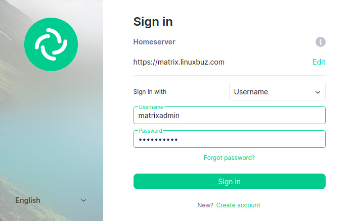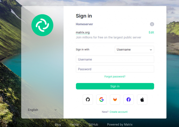 También puedes verificar tu Matrix Synapse utilizando el cliente Riot basado en web https://riot.im/app/#/login. Deberías ver la siguiente pantalla:
