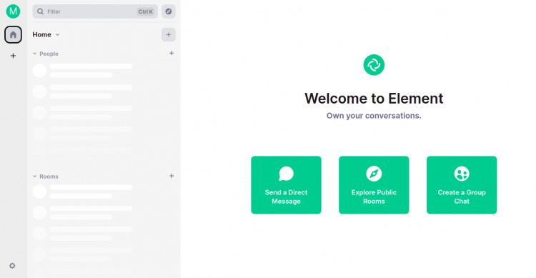 Proporciona tu nombre de usuario y contraseña de administrador y haz clic en el botón Iniciar sesión. Una vez conectado al servidor Matrix Synapse. Deberías ver la siguiente pantalla: