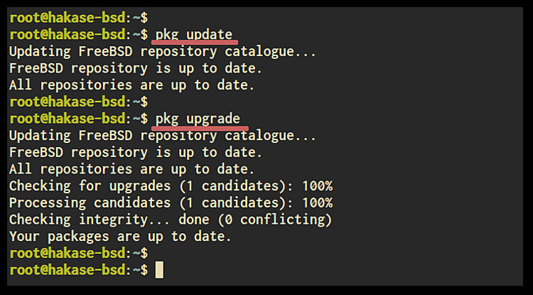 En primer lugar, actualizaremos el repositorio de paquetes y actualizaremos todos los paquetes a la última versión utilizando la herramienta de gestión de paquetes pkg para FreeBSD.