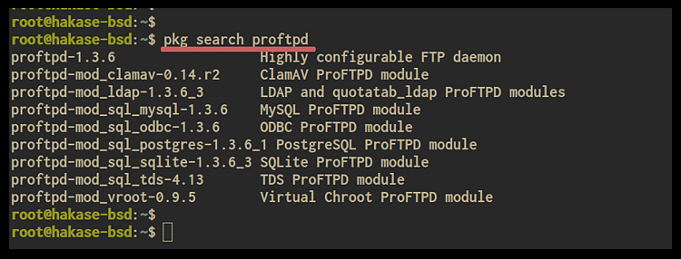 En este paso vamos a instalar el paquete ProFTPd. El repositorio de FreeBSD proporciona el paquete ProFTPd y otro módulo para la base de datos backend, como un módulo para bases de datos MySQL, PostgreSQL y SQLite.