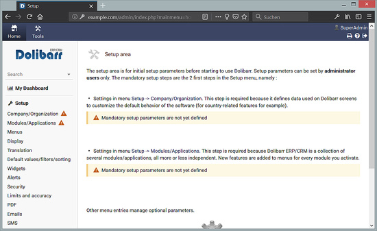Ahora, proporciona tu nombre de usuario y contraseña de administrador. A continuación, haz clic en el botón de conexión. Deberías ver la página de configuración de Dolibarr: