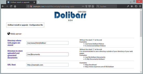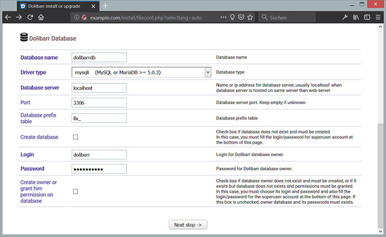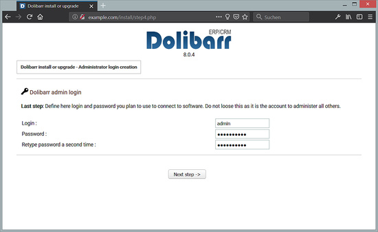 Ahora, abre tu navegador web y escribe la URL de tu sitio web Dolibarr, en mi caso http://example.com. Serás redirigido a la siguiente página: