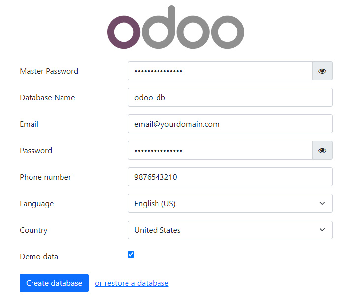 Elige tu correo electrónico y contraseña para crear tus credenciales de acceso. La contraseña maestra es la admin_passwd que añadiste en el archivo /etc/odoo.conf. Rellena todos los campos restantes.