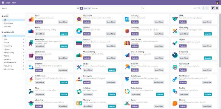 Odoo (antes conocido como OpenERP) es un conjunto autoalojado de más de 10.000 aplicaciones de código abierto para diversas necesidades empresariales, como CRM, comercio electrónico, contabilidad, inventario, gestión de proyectos y punto de venta. Estas aplicaciones están totalmente integradas y se accede a ellas a través de una interfaz web familiar.