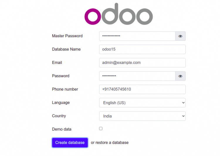 Ahora, abre tu navegador web y accede a la interfaz web de Odoo 15 usando la URL http://odoo15.example.com. Deberías ver la página de configuración de la base de datos de Odoo 15: