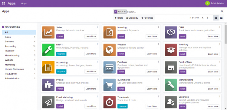 Odoo, antes conocido como OpenERP, es uno de los principales software ERP utilizado para gestionar procesos empresariales. Viene con aplicaciones y módulos relacionados con la empresa como CRM, Ventas, facturación, contabilidad, fabricación, almacén y más. Es una buena solución ERP para pequeñas y medianas empresas. Odoo ERP se utiliza en muchos sectores, como empresas de fabricación, empresas de distribución, empresas de I+D, empresas de servicios, empresas de contabilidad, etc.