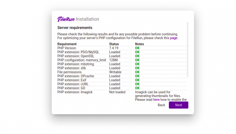 Haz clic en el botón Siguiente. Deberías ver la pantalla de comprobación de los requisitos del servidor: