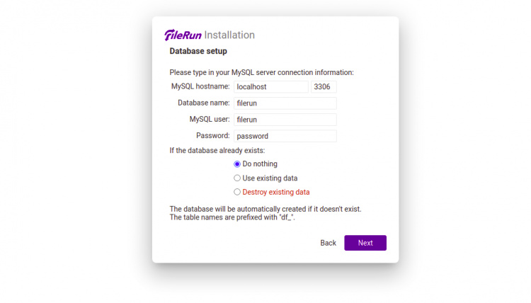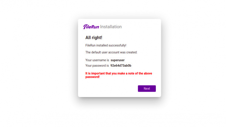 Proporciona tus credenciales de la base de datos y haz clic en el botón Siguiente. Una vez instalado el FileRun, con éxito, deberías ver la siguiente pantalla: