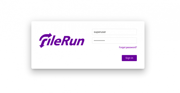 Anota tu nombre de usuario, tu contraseña y haz clic en el botón Siguiente. Deberías ver la pantalla de inicio de sesión de FileRun: