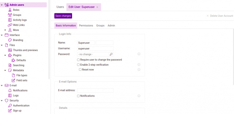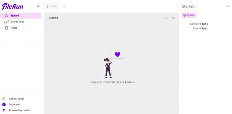 Indica tu nombre de usuario y contraseña de administrador y haz clic en el botón Iniciar sesión. Deberías ver el panel de control de FileRun en la siguiente pantalla: