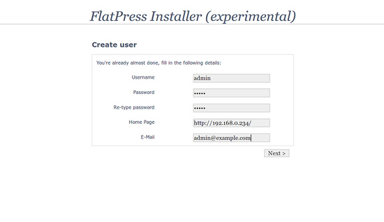 Ahora, abre tu navegador web y escribe la URL http://example.com. Serás redirigido a la página de instalación de FlatPress: