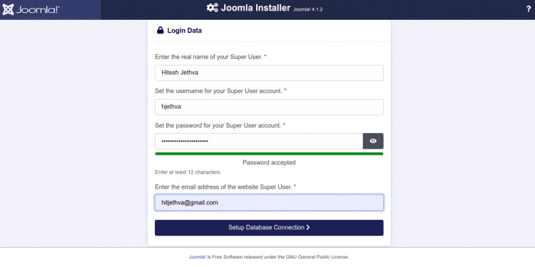 Proporciona tu nombre de usuario y contraseña de administrador y haz clic en Configurar la conexión a la base de datos. Deberías ver la siguiente pantalla: